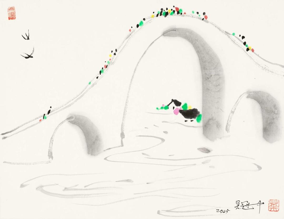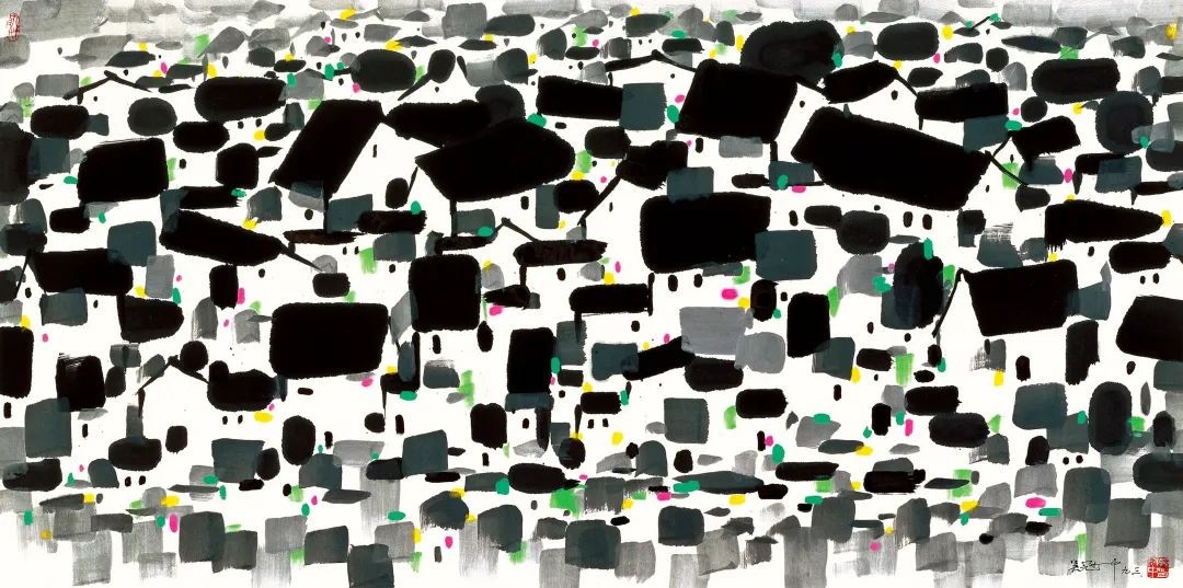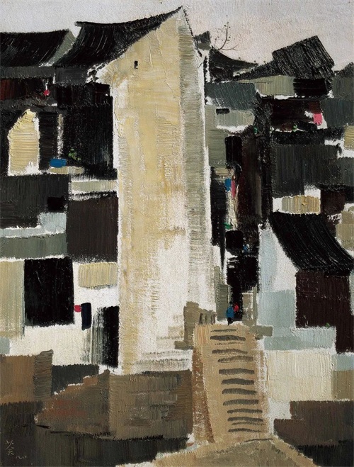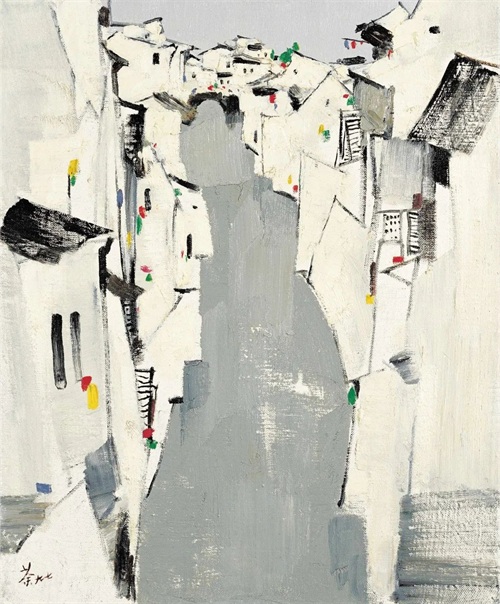这幅作品以江南民居为题材,将白墙黑瓦提炼为纯粹的几何构成,寥寥数笔就勾勒出东方建筑的神韵。
