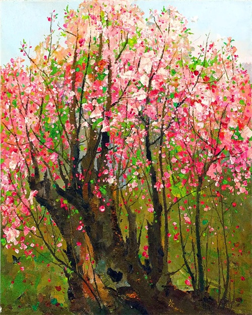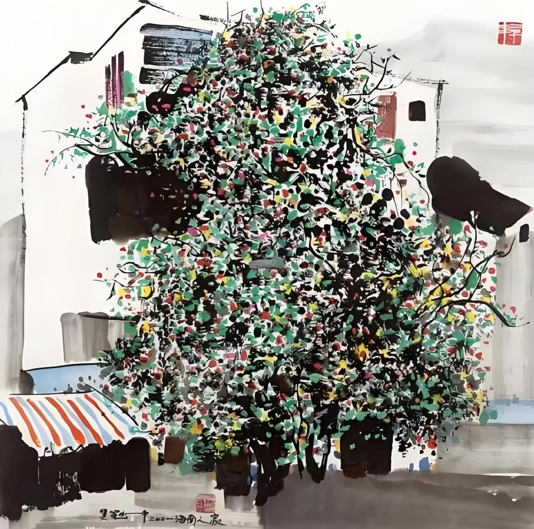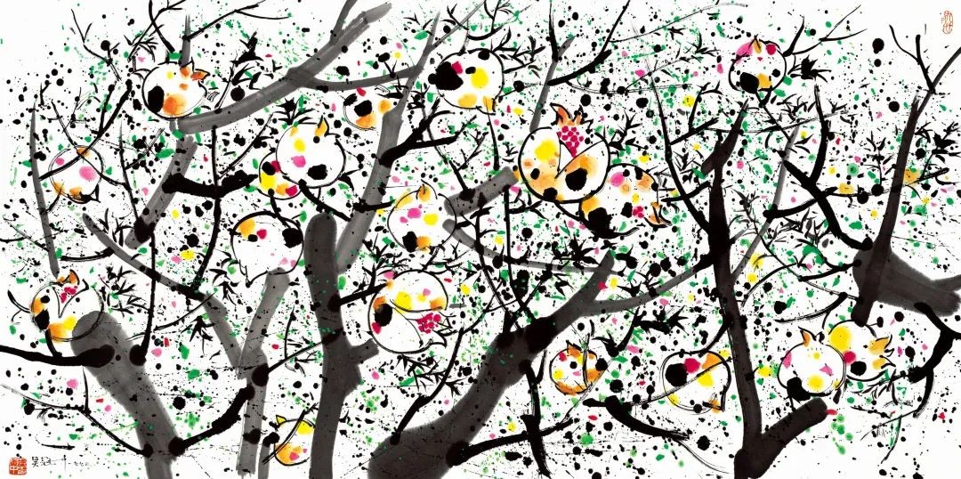 画面中遒劲的枝干采用书法笔意,而鲜艳的红点则吸收了西方表现主义的色彩张力。