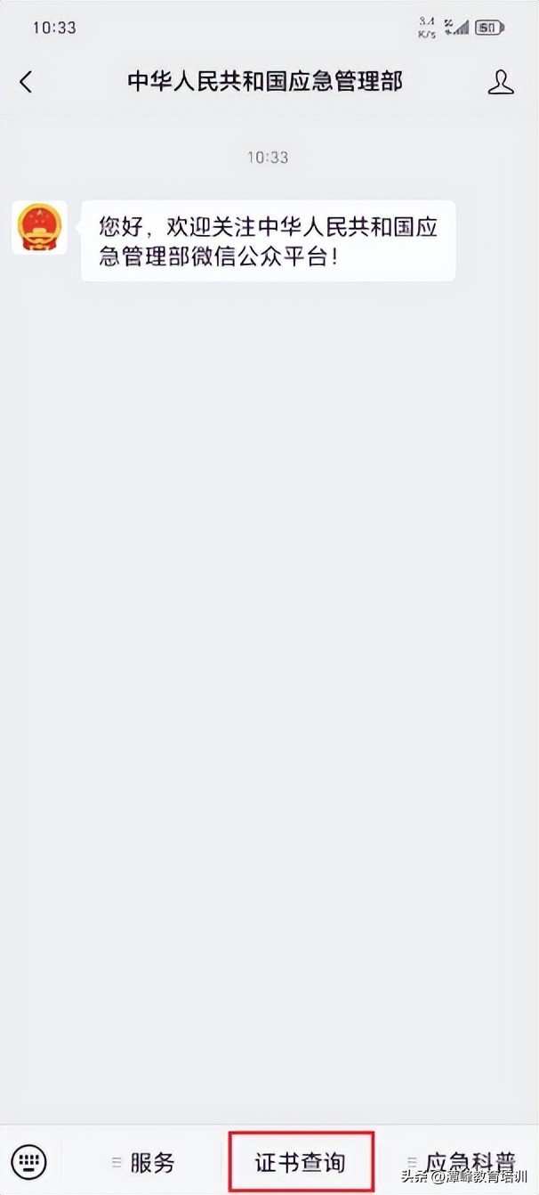 方法一:关注“应急管理部”微信公众号,通过底部菜单栏【证书查询】,进入查询平台。