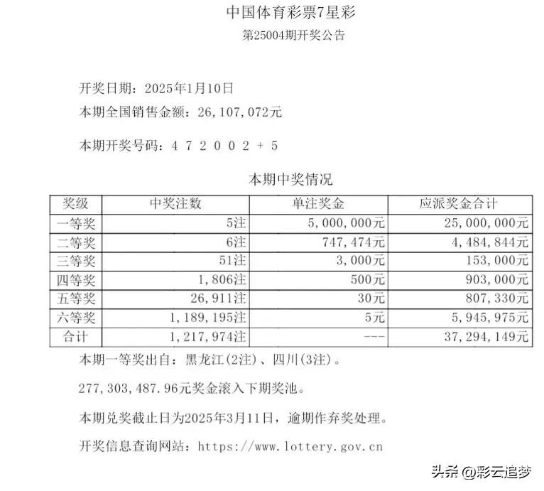 7星彩5注一等奖,排五514注。1月10日中国体育彩票开奖结果