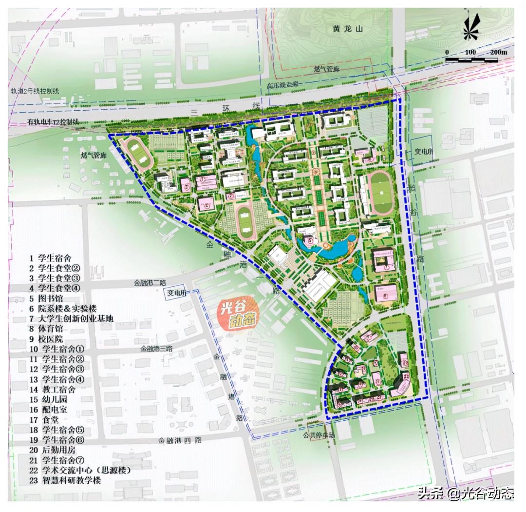 校区西北重点建设学生食堂、学生宿舍,沿光谷一路侧建设院系楼、大学生创新创业基地、体育馆,原址扩建校图书馆;南校区重点建设校医院、学生宿舍、智慧科研教学楼、学术交流中心、食堂、后勤用房等。
