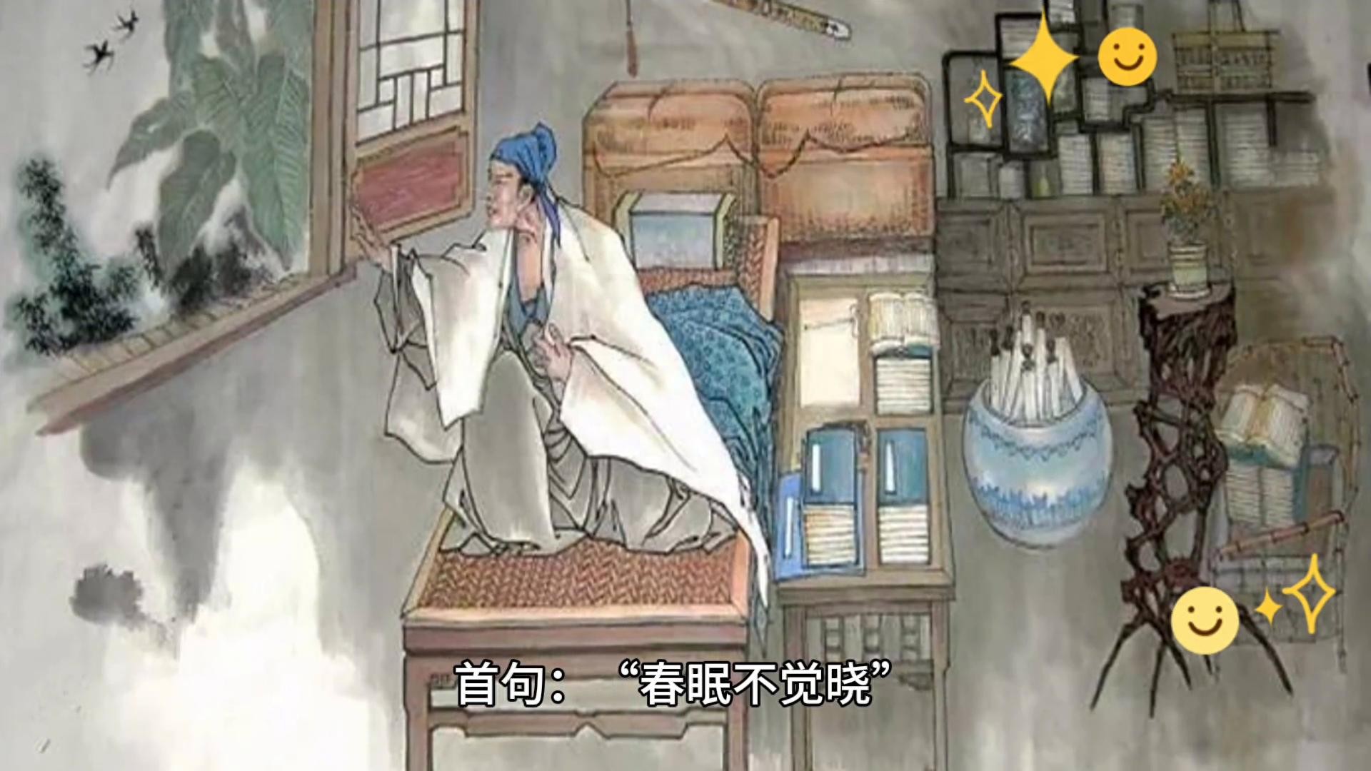 ·首句:“春眠不觉晓”。诗人以春天早晨自己一觉醒来为起点,表达了在春天里睡眠的香甜与满足。不知不觉天已大亮,流露出诗人对朝阳明媚的喜爱。