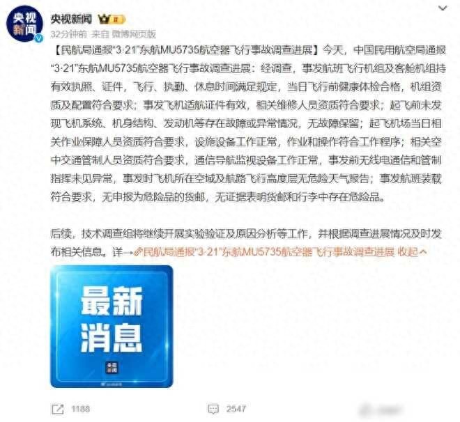 今日,央视新闻报道指出,民航局通报“3·21”东航MU5735航班事故调查结果,称飞机起飞前并未发现任何系统故障或异常情况。这一消息引发了公众的广泛关注和热议。