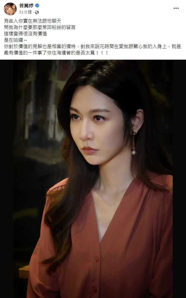 曾莞婷24日PO文,透露自己被说「常回粉丝留言变得很没有价值」,她傻眼反讽对方对于价值的见解「相当独特」,「对我来说,花时间在爱我跟关心我的人身上,就是最有价值的一件事了。」回呛:「你住海边管的是否太宽!」并附上一张表情严肃的霸气照片。