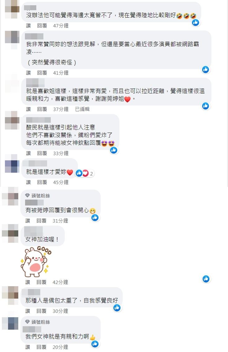 曾莞婷的PO文贴出后,引来许多粉丝力挺说「有亲和力很好啊」、「这样才圈粉」、「那人偶包太重」、「可以收到女神的回应是多么幸运的事情」,而曾莞婷也感谢粉丝带给自己正向的力量。