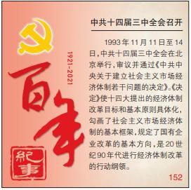 1993年11月11日至14日,中共十四届三中全会在北京举行,审议并通过《中共中央关于建立社会主义市场经济体制若干问题的决定》。《决定》使十四大提出的经济体制改革目标和基本原则具体化,勾画了社会主义市场经济体制的基本框架,规定了国有企业改革的基本方向,是20世纪90年代进行经济体制改革的行动纲领。