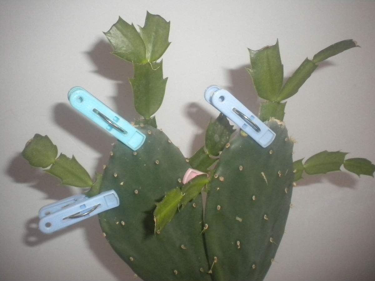 不论是从仙人掌的顶上面,还是从它的旁边,都是可以做扦插的,在把蟹爪兰插进去了以后,这时候蟹爪兰还特别的不稳定,容易往旁边掉,所以要多用东西固定起来,可以用几个夹子夹起来,这样蟹爪兰就不会往下掉了。
