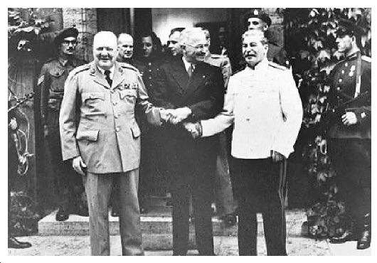 英、美、苏三国元首在波茨坦会晤,前排左起分别是:丘吉尔、杜鲁门、斯大林