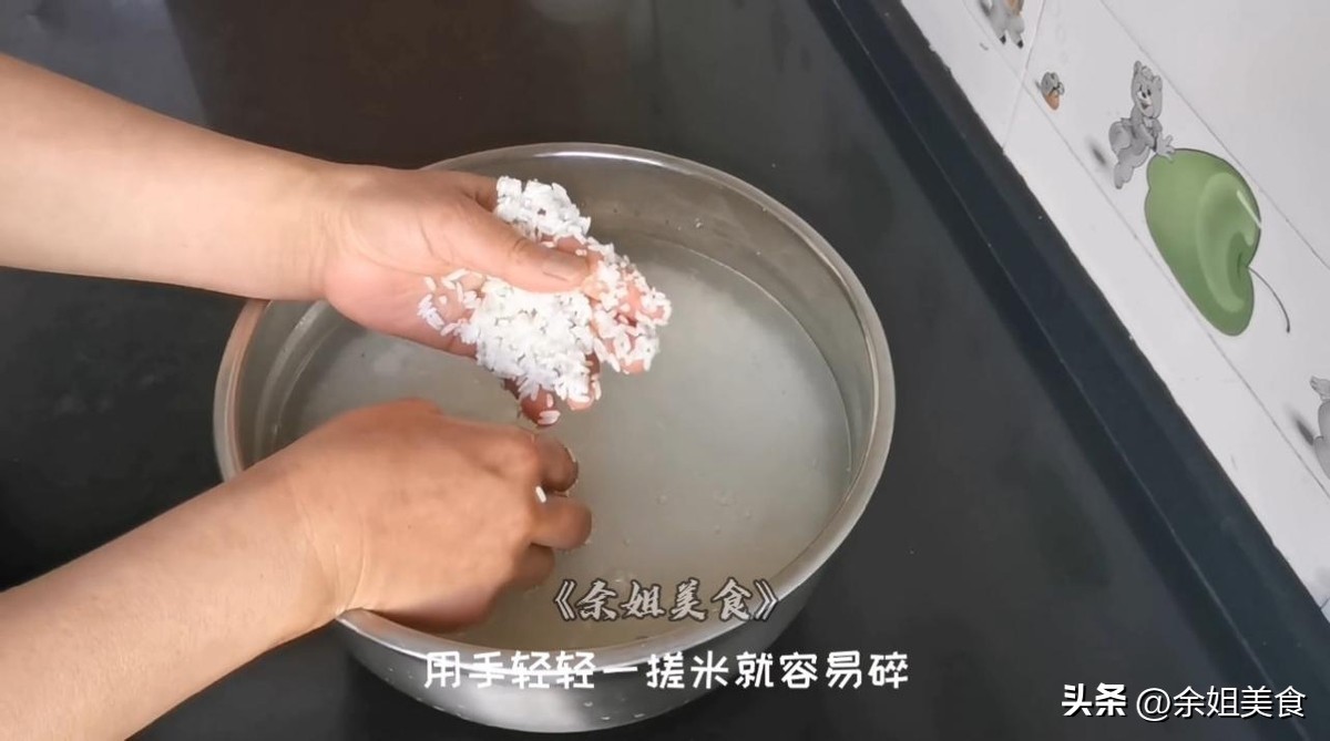 1,这是我泡了一个晚上的糯米,用手轻轻一搓,米就容易碎,米就算泡好了。
