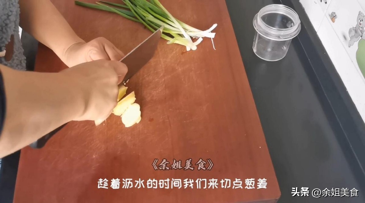 3,沥水的时间我们来切点葱姜,加少许水用破壁机打一点葱姜水备用。
