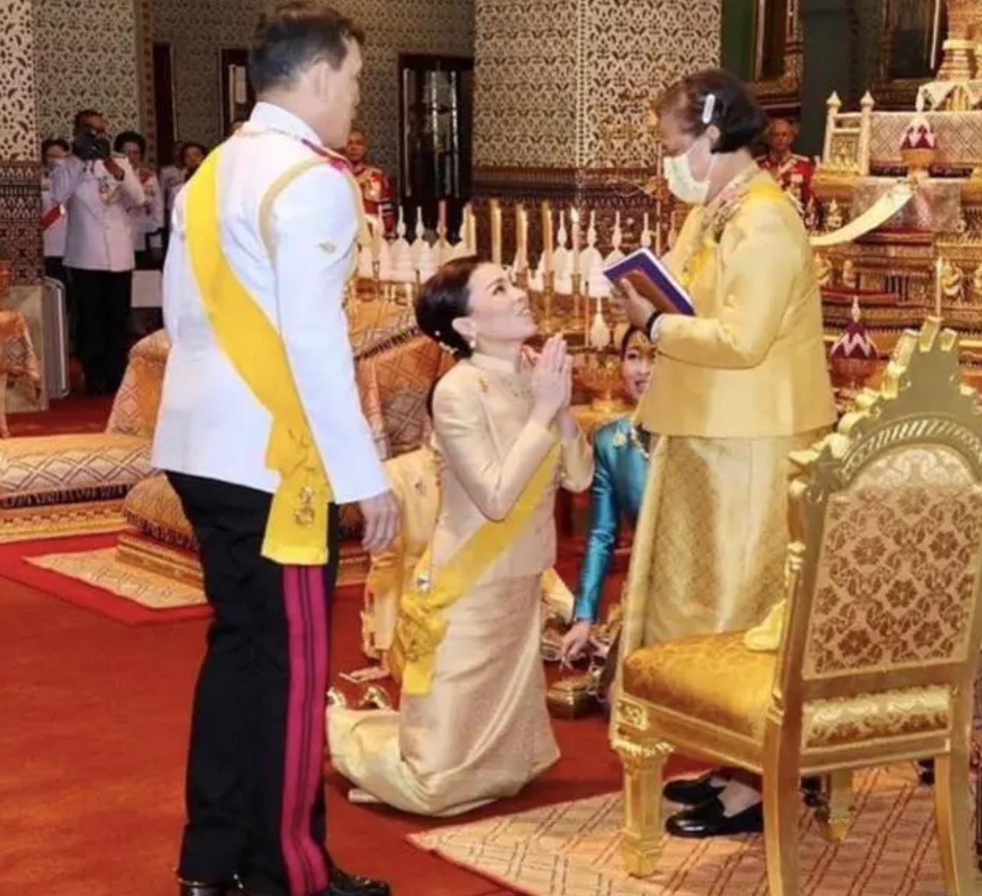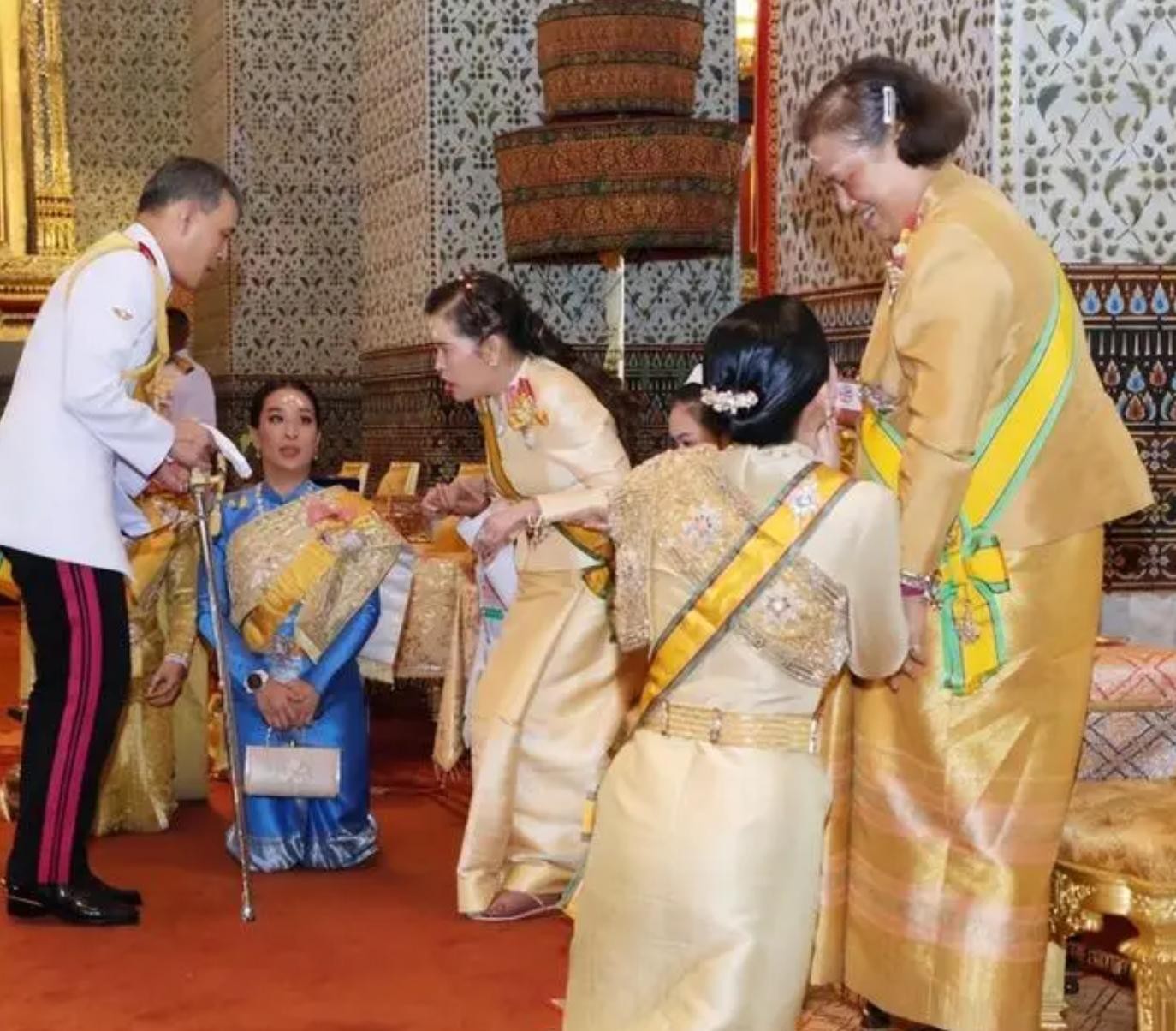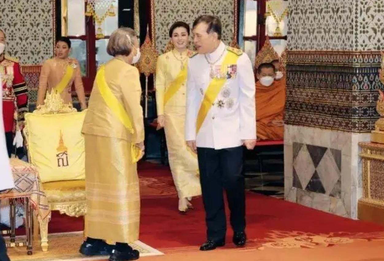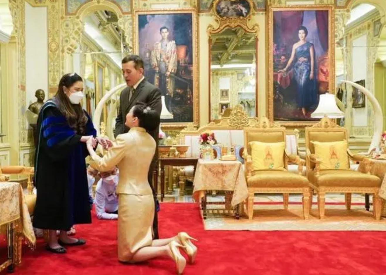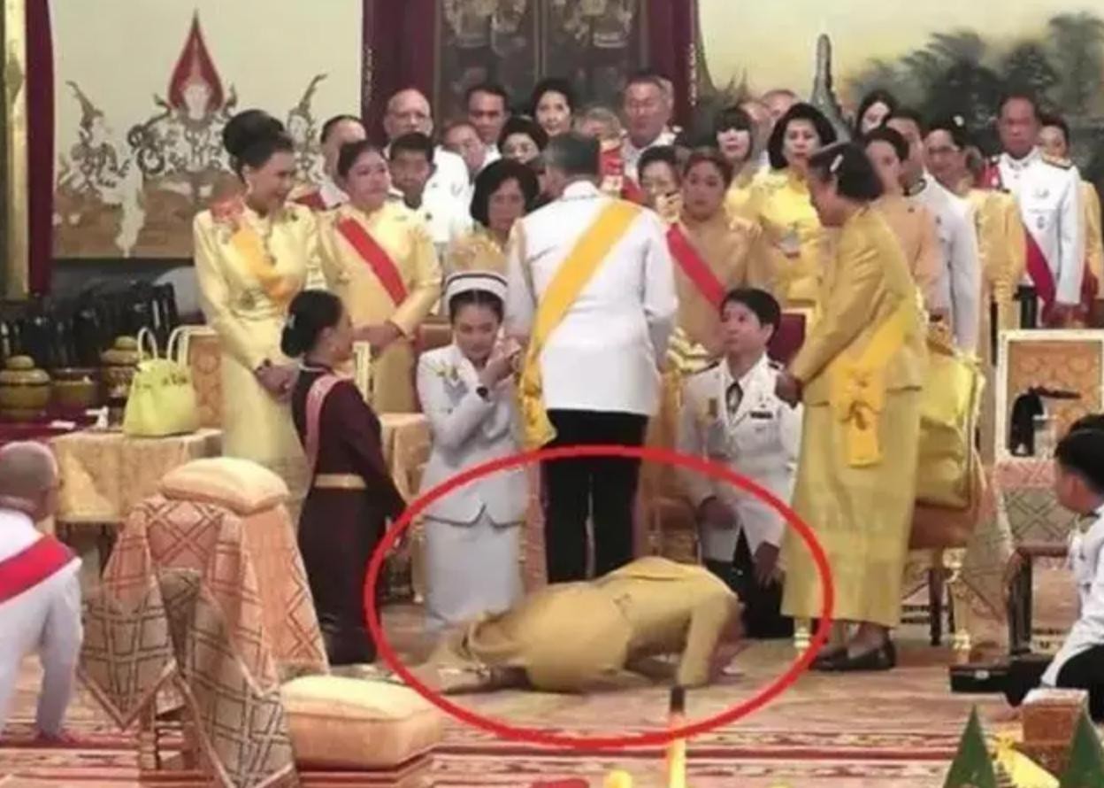 在泰国王室,帝后同框现身,沿街百姓会跪拜,护卫队和王室成员同样要跪拜,最美总理佩通坦要下跪行礼,文武百官要匍匐跪拜。这就意味着不论走到哪里,下跪环节都在正常不过,即使苏提达王后都要下跪正统王室成员和亲属。