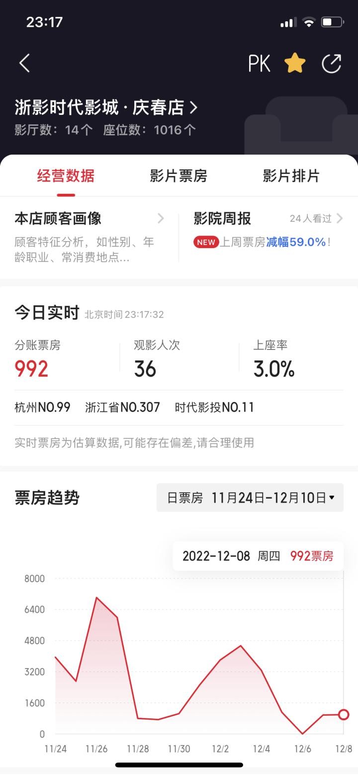 钱江晚报·小时新闻记者在“猫眼电影”专业版上看到,“庆春”的营业永远停格在了2025年12月8日,当日票房992元,观影人次36人,在杭州排名99位。