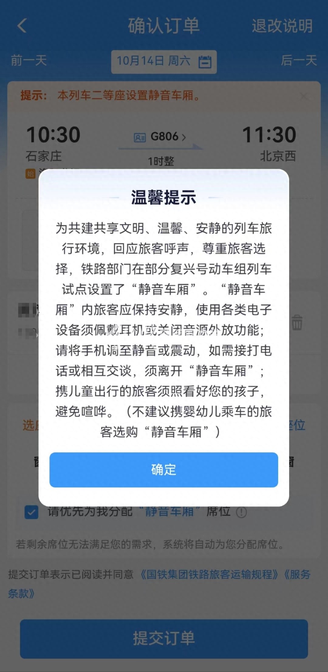 10月13日,记者打开12306APP搜寻第二天石家庄前往北京的列车发现,14日石家庄至北京G806、G66、G54、G526列车二等座均设置静音车厢,相应车次标识后有“静”字作为提示。在确认订单页面,乘客可勾选“请优先为我分配静音车厢席位”选项,选项后附有“温馨提示”:车厢内旅客应保持安静,使用各类电子设备须佩戴耳机或关闭音源外放功能;请将手机调至静音或震动,如需接打电话或相互交谈,须离开“静音车厢”;携儿童出行的旅客须照看好您的孩子,避免喧哗(不建议携婴幼儿乘车的旅客选购“静音车厢”)。