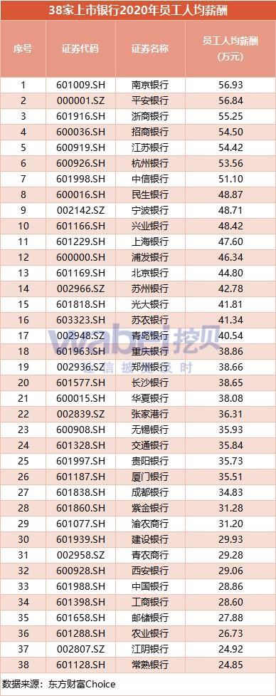 金融行业,特别是银行业,一直以来都被人们认为是高薪行业, 而之所以产生这个印象主要源自于上市银行的年报数据。以2020年度为例,按照各家企业发布的年度报告数据显示:2020年我国A股38家上市银行平均薪酬为32.6万元,其中南京银行以56.93万元问鼎榜首,排名垫底的为常熟银行,人均新酬为24.85万元。即使以人最低的常熟银行来看,银行业的人均月薪酬依然超过了2万元/月,这个薪酬即使在四大一线城市都不算低了,更何况广大的中小城市,那么银行薪酬真的有这么高吗?