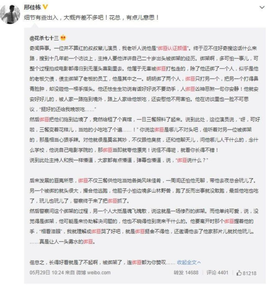 这可真是叫大家哭笑不得。都知道长得帅在社会上有优势,但是没想到优势居然这么大,长得帅被绑居然都可以得到优待。大概他自己也没有想到,绑架自己的劫匪居然是一个颜控。