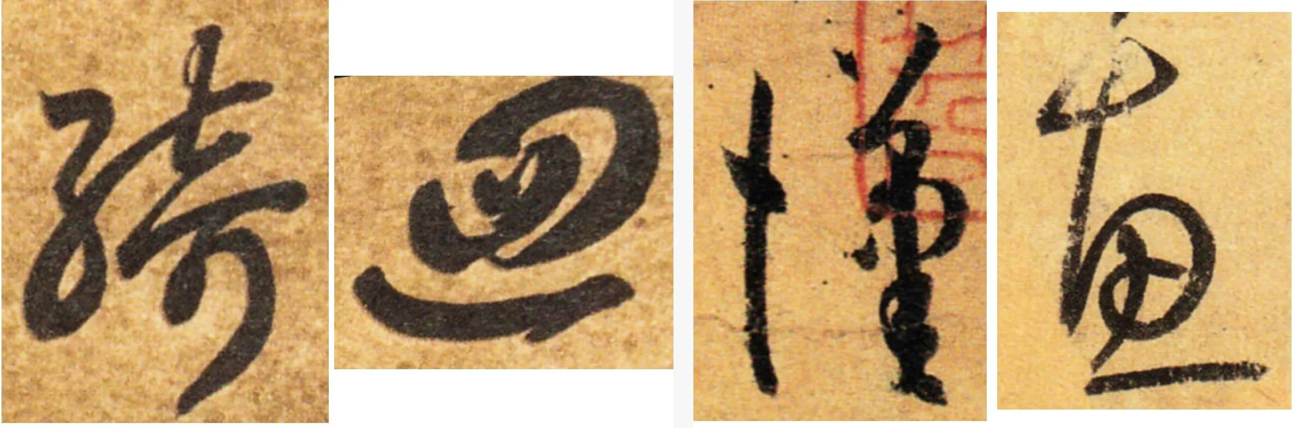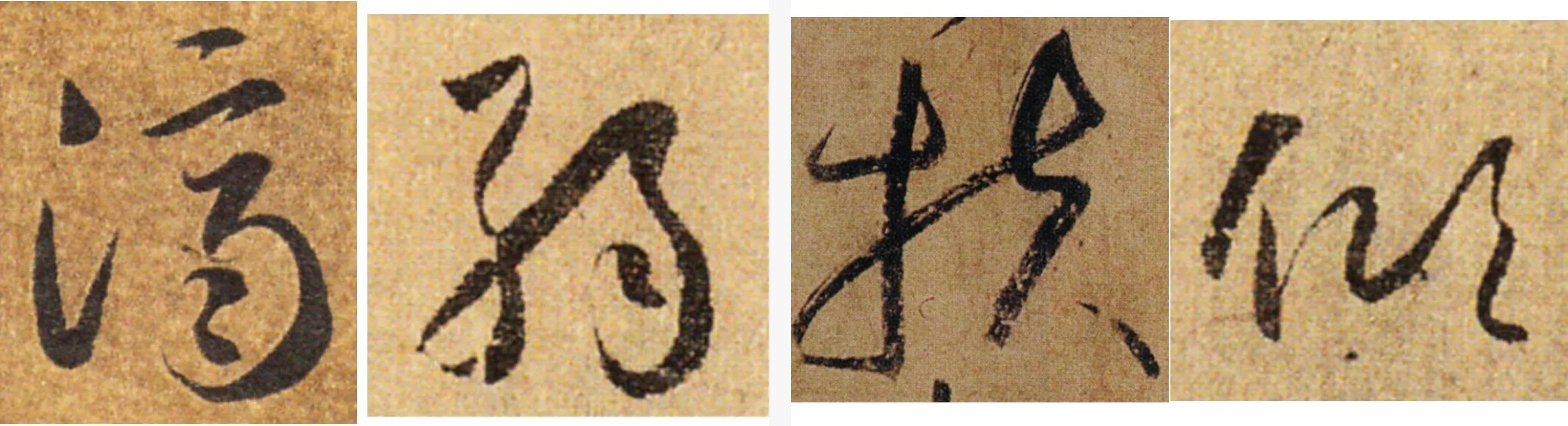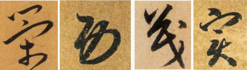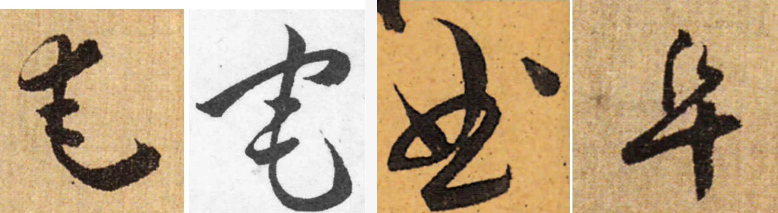 策,竹头写成三点或草头都可以,下部写成“宋”(宋无点是“荣”)。功,左右连写,比“劳”只少一点(“劳”像简体字“动”)。茂,草头+戈。实,同简体字,贯字头省为连点,“贝”草为“大”。