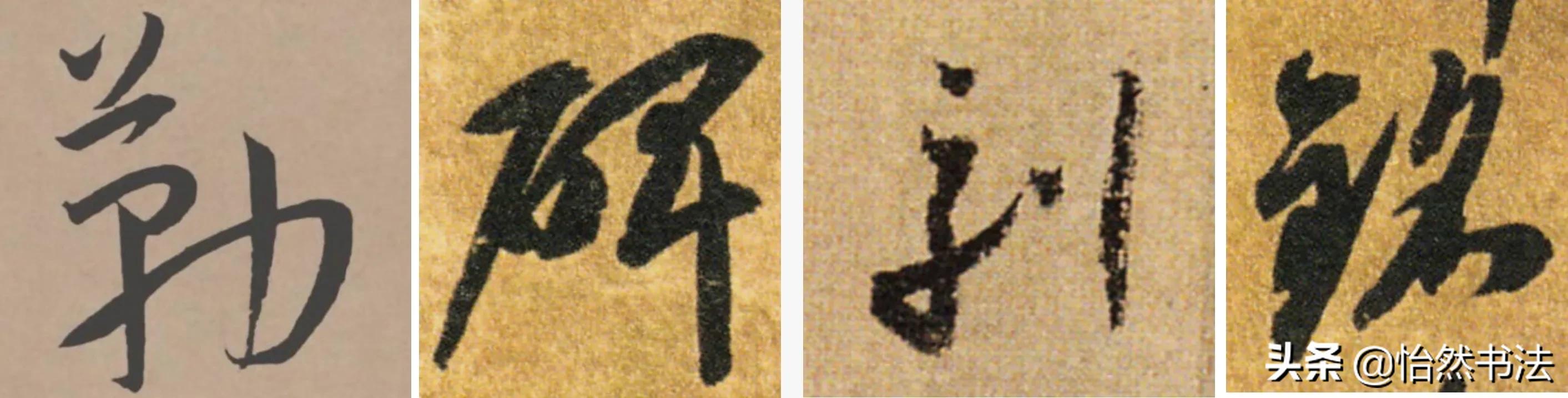 勒,左边革的头部省成草头,中间口部写成左右点或横,草头+提手=革字符。碑,左边“7+0”,右边“勾+干”(或弯+圈带+十),刻,左边写如马字符(点+子),右照写。铭,左边人字头+王,右边口部写成两点。