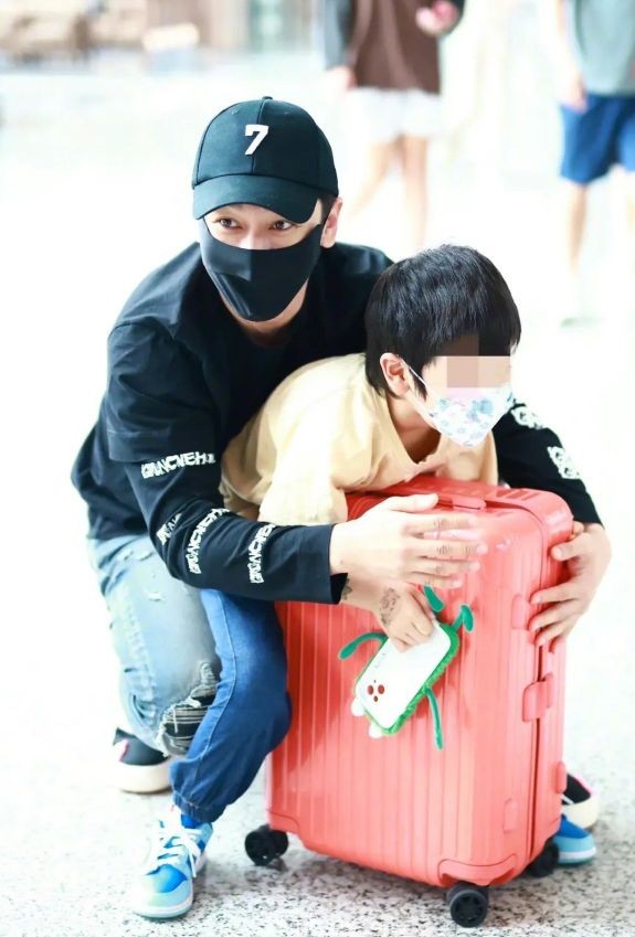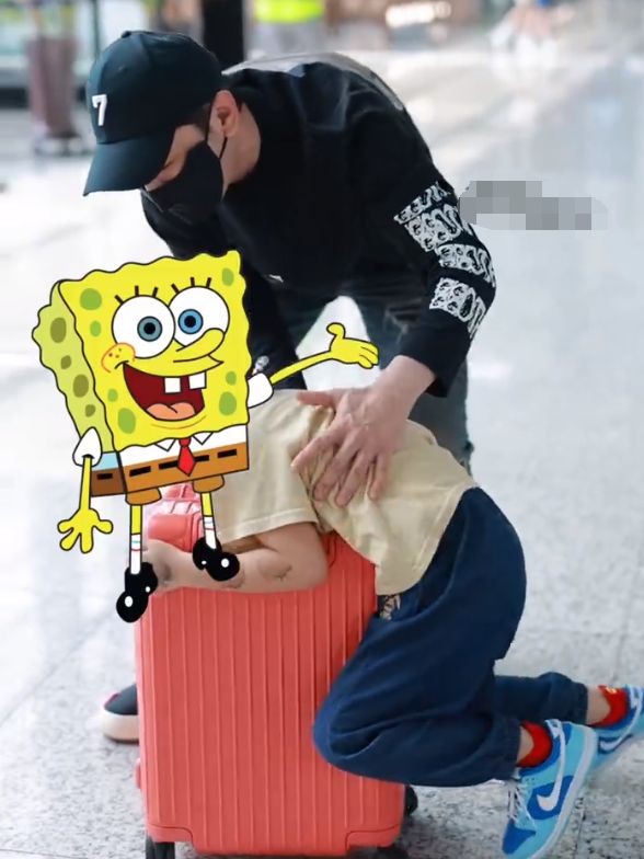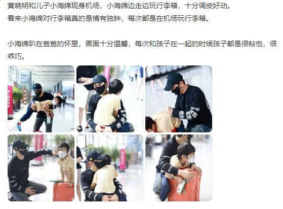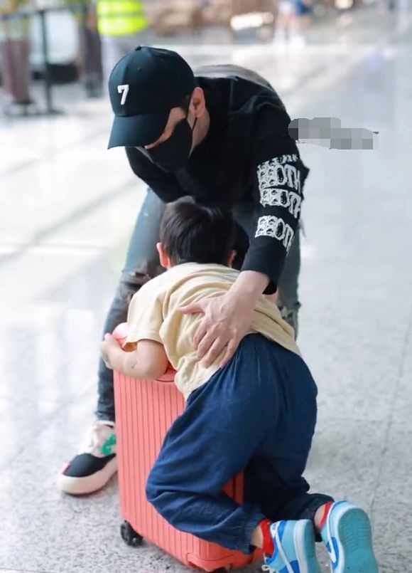 小海绵十分调皮,趴在行李箱上,一直动个不停,黄晓明对儿子非常贴心,蹲下来与他一起玩耍,小海绵也非常粘爸爸,时不时靠在爸爸怀里,显得十分呆萌可爱。