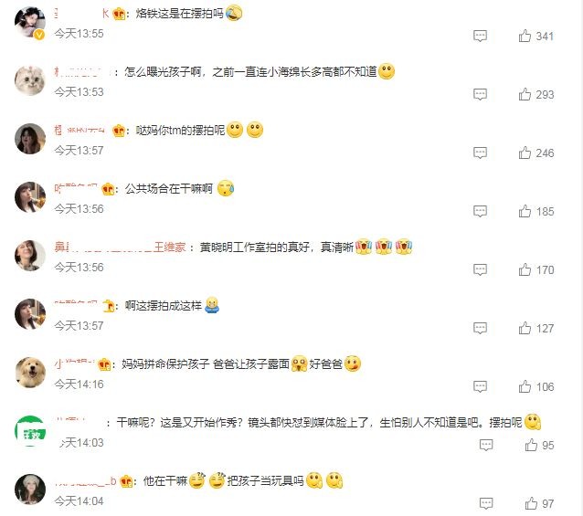 父子同框互动本是好事,但评论区却遭到了翻车,很多人吐槽,黄晓明这是在消费孩子,立好爸爸人设,媒体都拍到小海绵的脸上了,黄晓明也不阻止,显然是摆拍。翻看评论区,网友都在喊话,希望不要过度曝光小海绵。