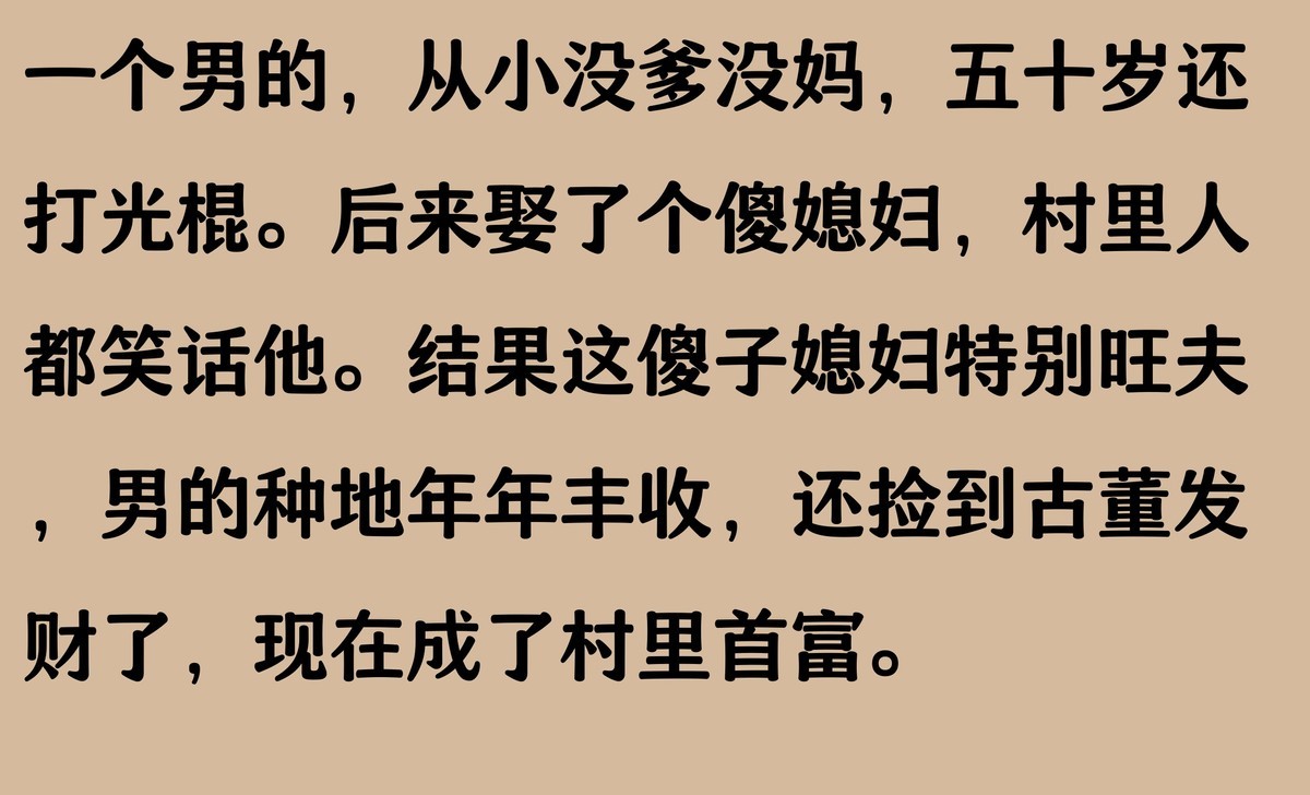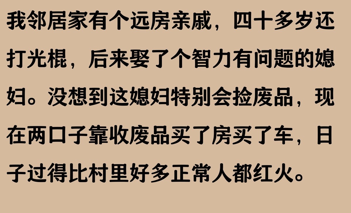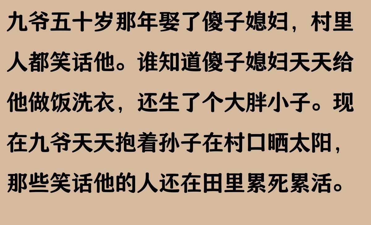 分人吧!我邻居九爷是个苦命人,从小没爹没娘,五十岁才娶上媳妇。那媳妇虽然脑子不太灵光,但特别勤快,把家里收拾得干干净净。九爷说娶了她之后,地里活有人帮忙,回家有热饭吃,连养的猪都比以前肥了。他说这辈子最大的福气就是娶了这个傻媳妇,现在日子越过越红火。