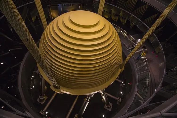 在大楼88层到92层,有一个大型的风阻尼器,重量高达660吨,主要部件是一个大金色钢球,它可以有效减少在大风环境下大楼的摆幅。当大厦要往右摆的时候,这个钟球就往左摆平衡掉大厦的摆幅,全程不需要动力部件,完全自主运行。这种阻尼器在超高建筑中很常见,迪拜塔上也有。