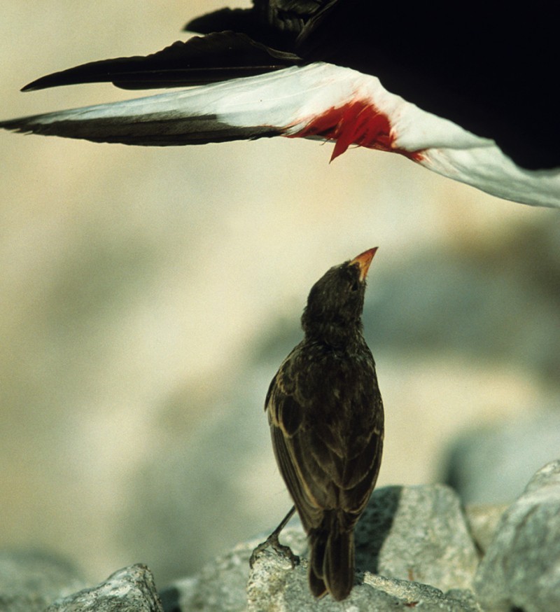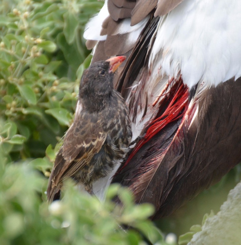 尖嘴地雀的食谱中本来并不包含动物鲜血,它们主要以海岛高地的仙人掌汁液、植物种籽和各种无脊椎小动物为食;然而在低地生活的尖嘴地雀在缺乏食材的情况下,便会主动帮大型海鸟清理表皮的寄生虫并吃掉,两者保持了很长一段时间的互利关系。直到偶然一回尖嘴地雀的喙戳破了海鸟的皮肤(啄羊鹦鹉:哈哈这位小兄弟,历史总是惊人地相似啊~),滴下的鲜血让尖嘴地雀无意间获得了寄生虫没有的丰富水分、油脂和盐分,从此它义无反顾地走上了嗜血的道路!