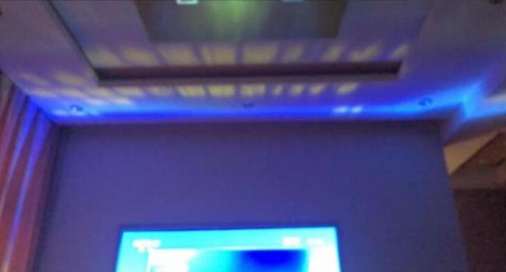 还有一个就是,它的光是从下面往上面投的,所以晚上光线暗的时候那个投射的光会反射到房顶上,然后再反射下来,在房顶形成一片五颜六色的光团,好看是挺好看,但是也挺影响人看电视的。总感觉这灯光不适合看电影,更适合蹦迪。