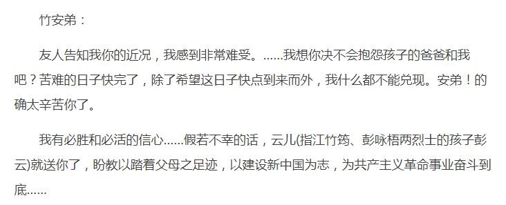 我有必胜和必活的信心……假若不幸的话,云儿(指江竹筠、彭咏梧两烈士的孩子彭云)就送你了,盼教以踏着父母之足迹,以建设新中国为志,为共产主义革命事业奋斗到底……