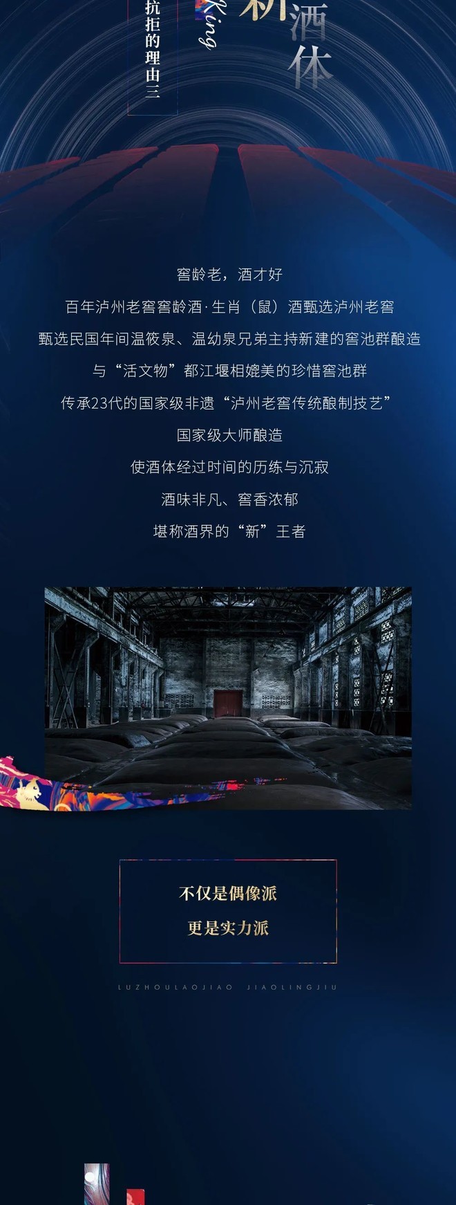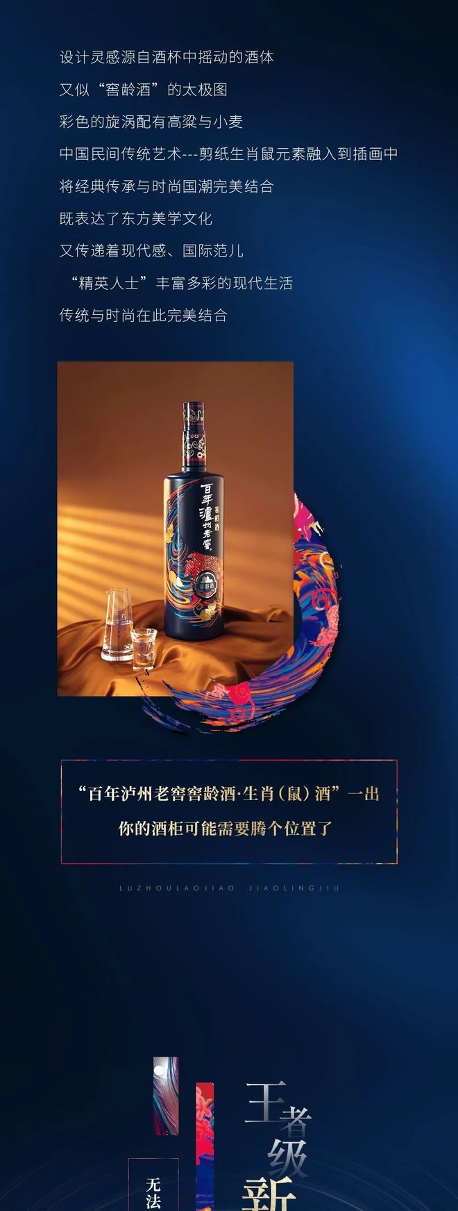 在整体设计上,产品通过百年泸州老窖窖龄酒经典的“太极”符号进行生肖化演绎成为“太极+子鼠”的形象,在继承传统的同事,凸显年轻时尚。外观设计则延续“窖龄酒90年”的造型和蓝色色彩基调,以保持品牌的整体统一调性和品牌识别度。