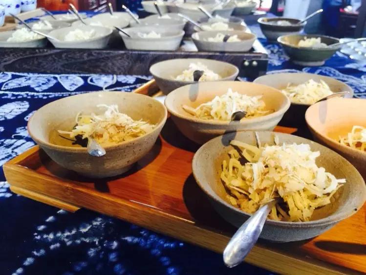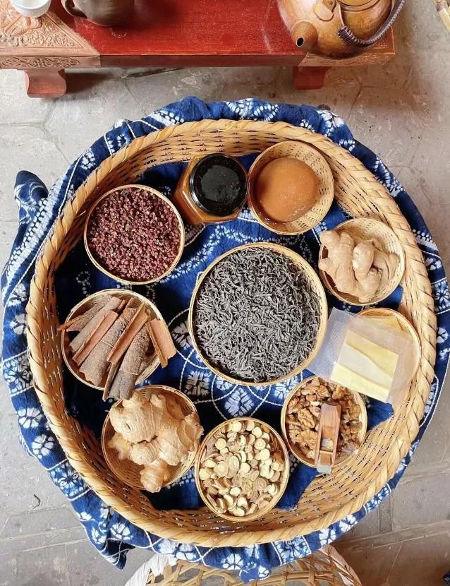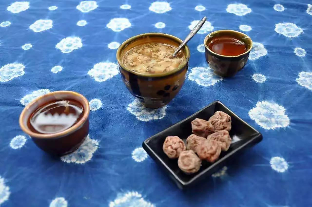 第三道“回味茶”。这道茶要先将蜂蜜、花椒、姜片、桂皮、枇杷叶掺入水中煮沸,之后再以此茶底冲入烘焙好的茶叶中搅拌均匀,即可饮用。白语中,“辣”与“亲”、“麻”与“富”同音,茶中放入花椒、生姜、桂皮,其中蕴含着和和睦睦、亲亲热热及大富大贵之意。茶的味道兼具苦、甜、香、麻、辣等各种味道,相互交错,仿佛有一位老者在夕阳中独坐于黄昏下,一个人静静地感悟人生沧桑一样。饮次茶能祛除湿气,使人体免受温湿气的侵害,有助健康。