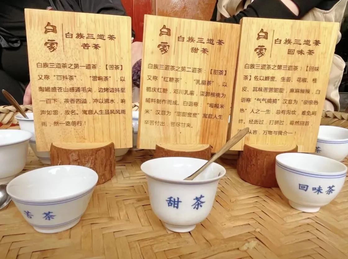 三道茶的制作要求严格。有 “三道”“六则”“十八序”。其中的“三道”,即指此茶分为三道,味道迥异,分别对应“一苦、二甜、三回味”的人生哲理,这也是白族三道茶名字的由来。