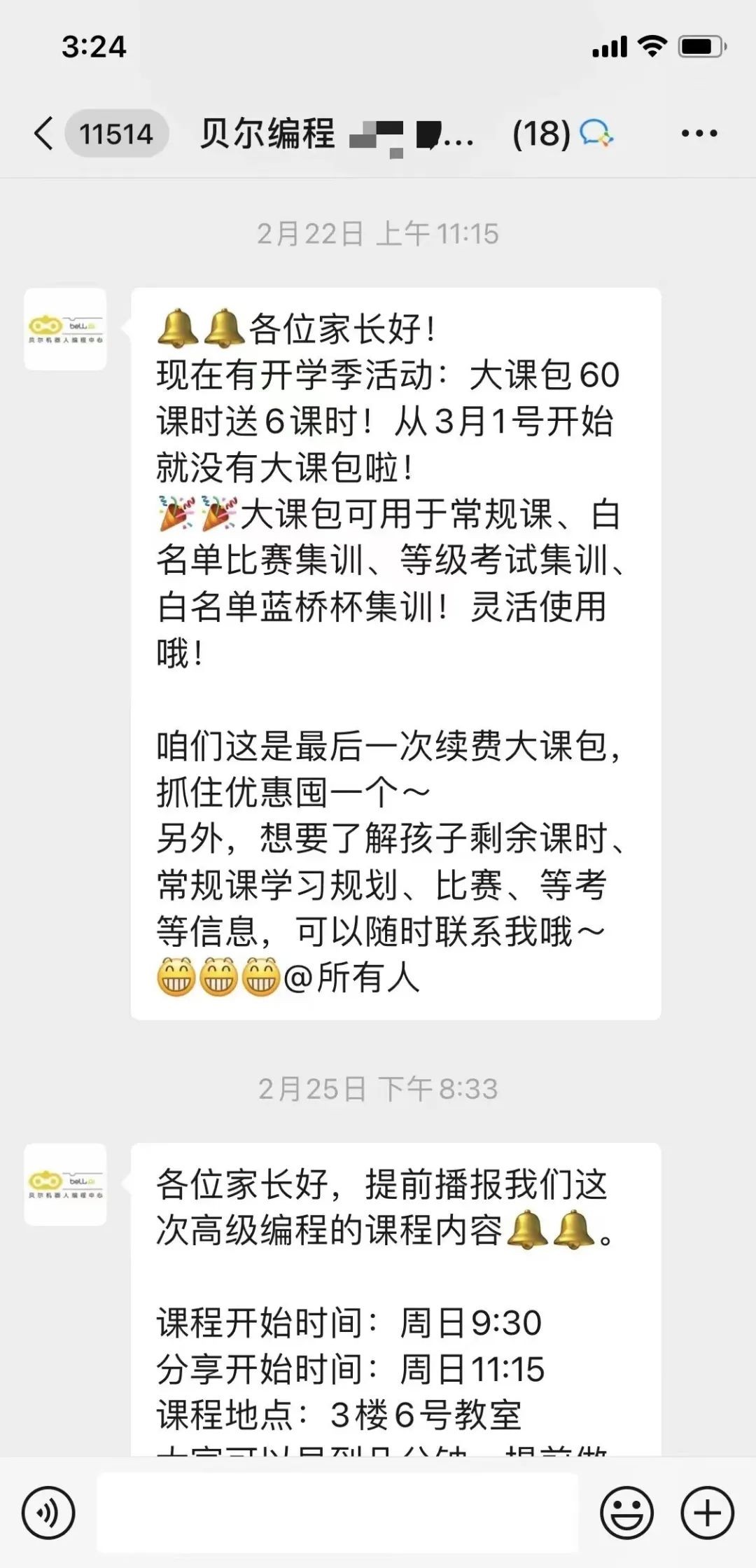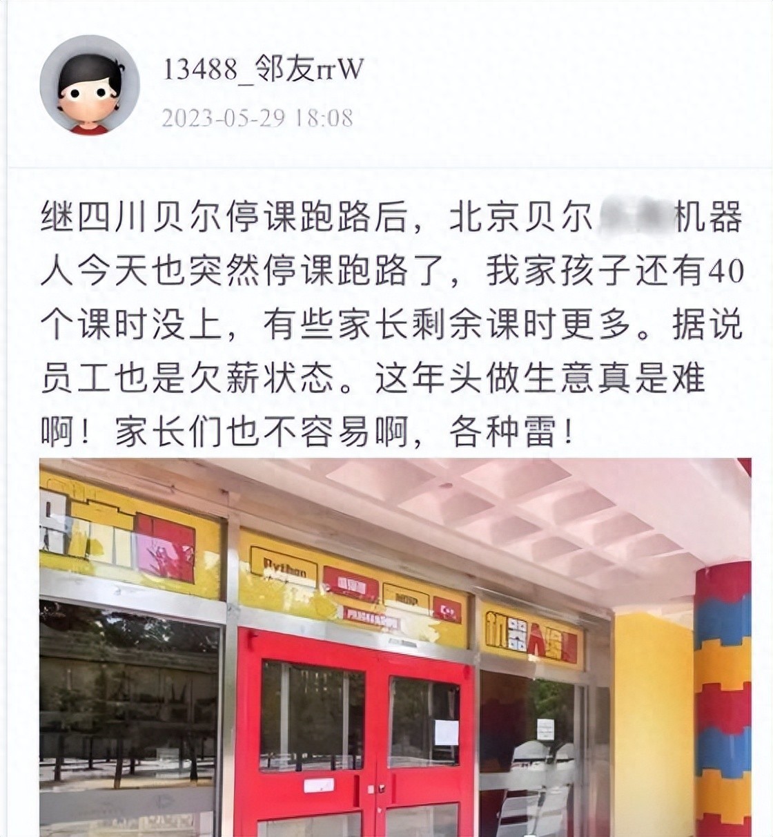 近日,有家长反映,北京一家经营多年的编程培训机构——贝尔机器人编程,突然关闭!家长们称,在贝尔机器人家长(通州)维权微信群里,有300多位家长。“初步统计,大家目前剩余课时费加起来就已经达到了200多万。“前一天还上着课呢,第二天就关停了,剩余上万金额的课没上,家长维权艰难,希望有关部门多多重视这些问题!”