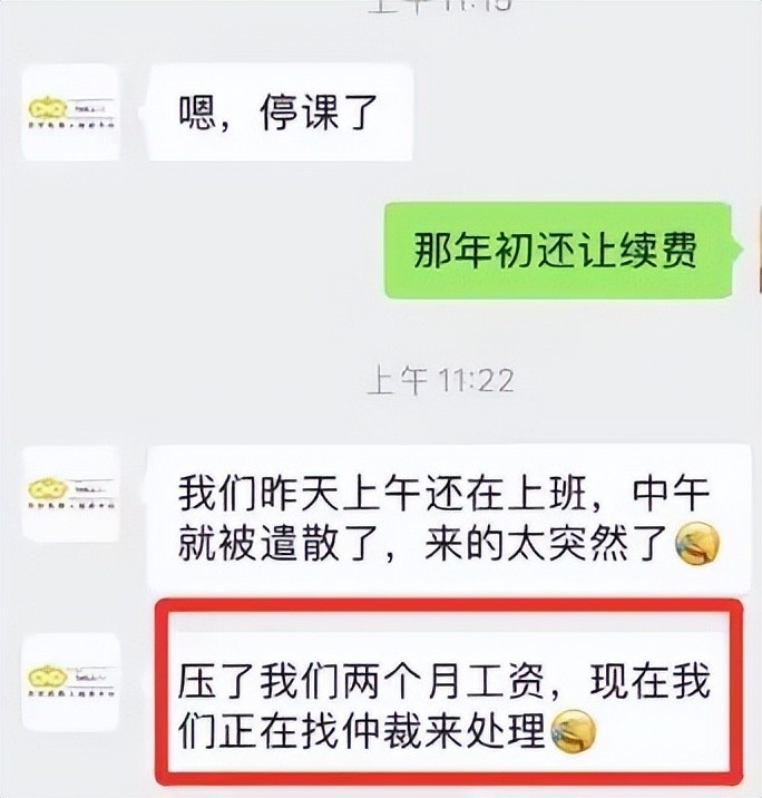 扬州一位家长晒出当地贝尔的机构通知说:5月11日扬州贝尔收到总部口头通知,全国范围所有的贝尔直营店全部撤店,不出任何书面通知。5月15日该发工资的时候也没有发工资,查询社保医保发现已经欠缴3个月。孩子们的课和欠薪事宜后期怎么处理,总部暂无告知。