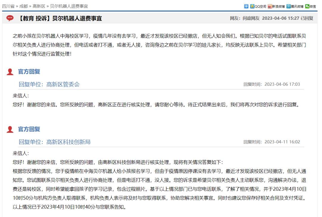 截至2023年5月14日,四川日报全媒体“问政四川”平台已经收到80余起市民投诉贝尔教育相关机构“培训费退费难”“机构倒闭”等问题。