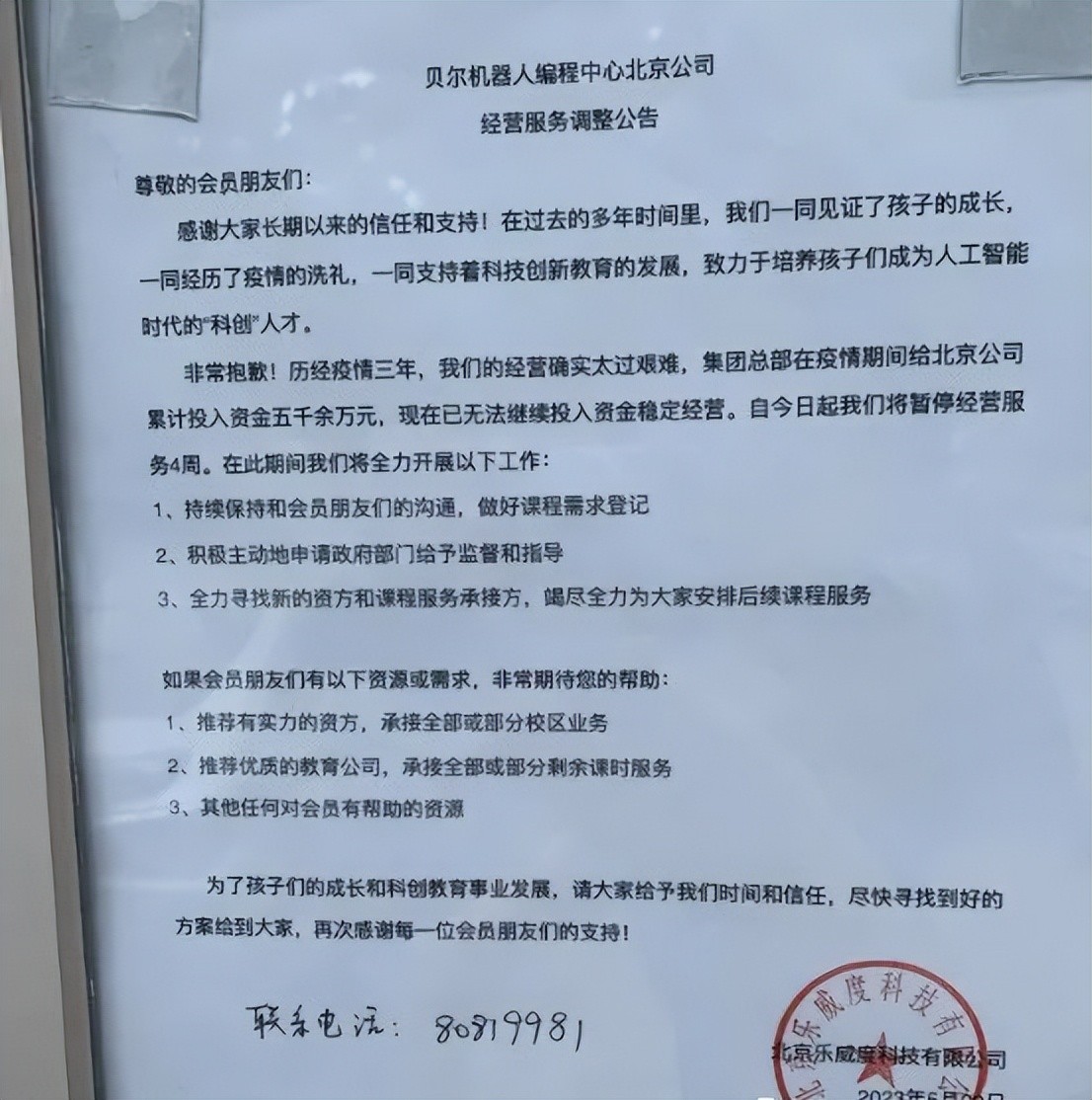 贝尔机器人中心北京公司在5月29日的一则《经营服务调整公告》中称:“非常抱歉!历经疫情三年,我们的经营确实太过艰难。集团总部在疫情期间给北京公司累计投入资金五千余万元,现在已无法继续投入资金稳定经营。自今日起我们暂停经营服务4周。”