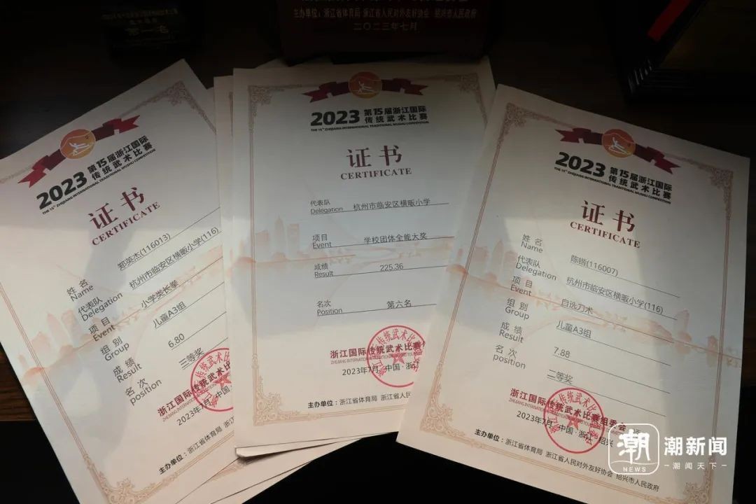 目前,“山娃武术队”的队员有60多位,在武术项目上的奖项,大大小小拿过不少:在第十五届浙江国际传统武术比赛中,获得集体项目第一名,以及“发展青少年儿童武术突出贡献奖”;陈锴、郑英杰等同学还在自选刀术、小学类长拳等项目中拿到个人奖项。四年级的学生蔡杭镖、张子辰还将代表临安出战高规格的武术比赛。