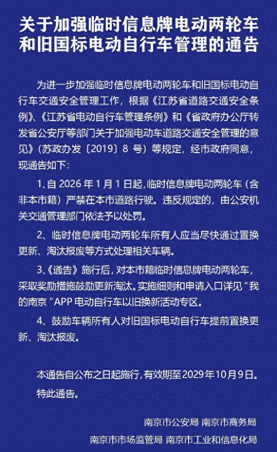 根据江苏省2019年出台的《关于加强电动车道路交通安全管理的意见》规定,临时信息牌过渡期不超过5年,过渡期满后不得再上道路行驶。因此,自2019年至2024年,临时信息牌事实上已满5年过渡期,但考虑到各类因素影响及市民群众生活生产实际需求,南京市决定将“小蓝牌”使用期限延至2025年底。即自2026年1月1日起,凡悬挂临时信息牌(含非本市籍)的电动两轮车禁止在南京市范围内道路上行驶,违反规定的,由公安机关交管部门依法予以罚款200元处罚。
