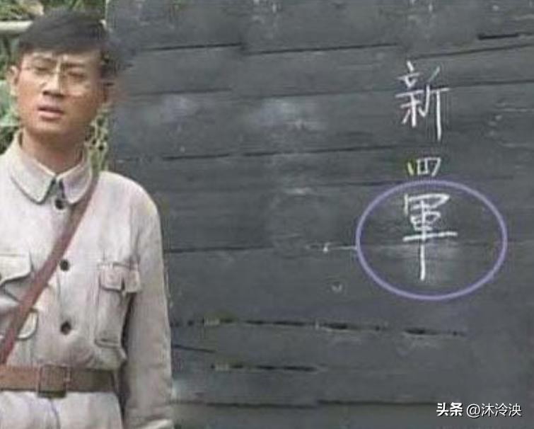 而在剧中另一个片段里,翰林正在部队里教战士们识字,只见他在一处黑色木板上用白色粉笔写上了“新四军”这三个字,这里我们需要注意的是,“军”这个字笔画的一横,是在黑色木板缝隙的下面。