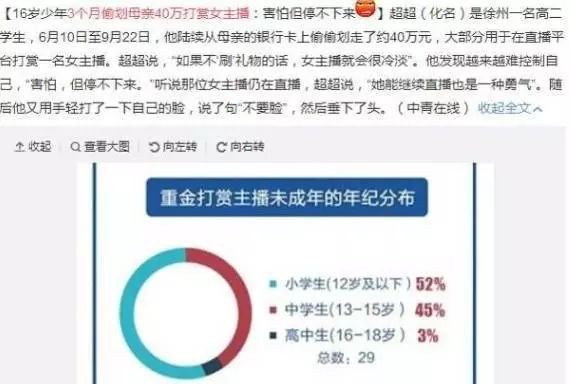 随着直播的普及,新鲜有趣的背后也有隐忧。未成年人在直播领域暴露的问题,不只存在于未成年主播。因直播平台本身具有打赏、发红包等功能,未成年人沉迷网络主播,巨额打赏事件频发。