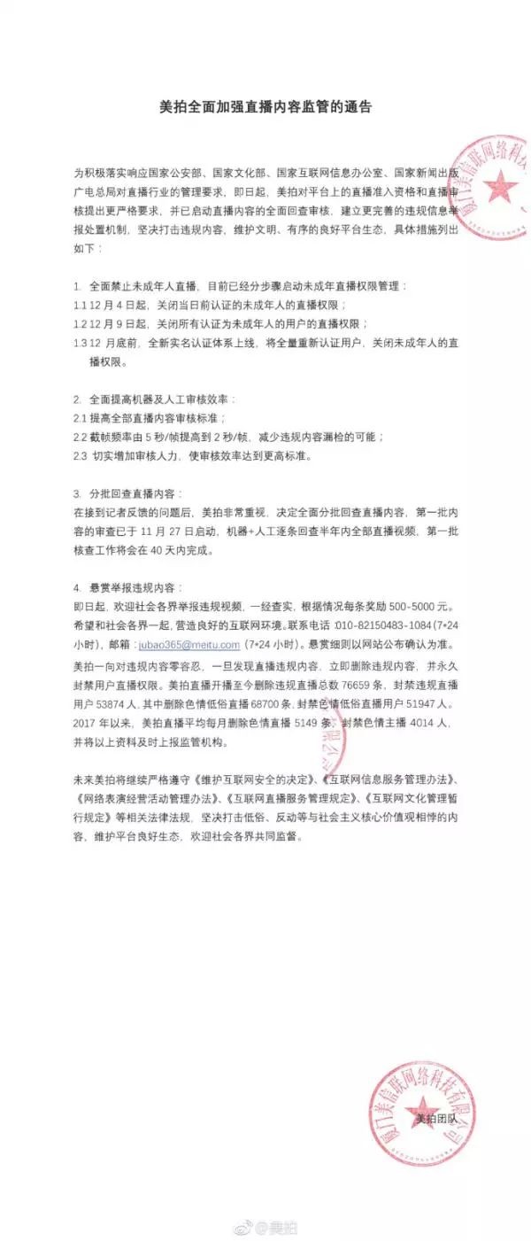 美拍发布称,12月4日起,关闭当日前认证的未成年人的直播权限。12月9日起,关闭所有认证为未成年人的用户的直播权限。12月底前,全新实名认证体系上线,将全量重新认证用户,关闭未成年人的直播权限。