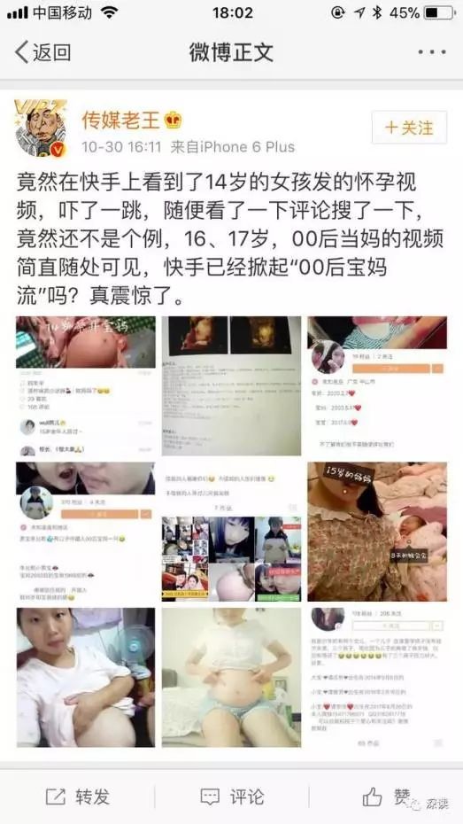 10月30日,网友“传媒老王”发微博称,在快手上看到14岁女孩发的怀孕视频,并配有多张视频截图。