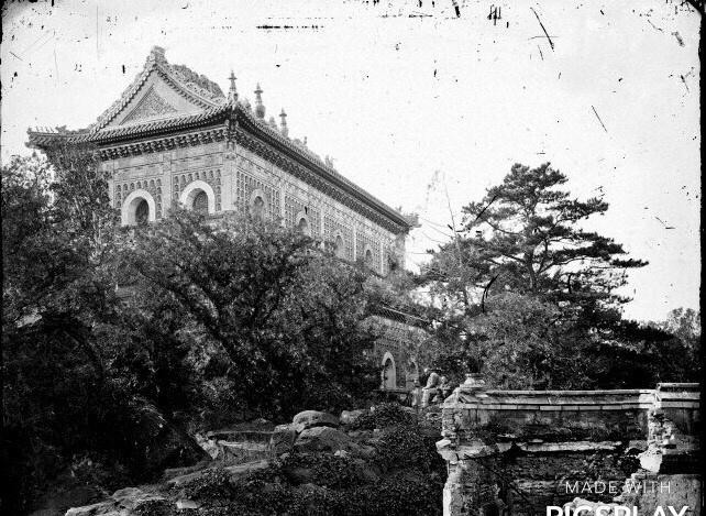 (14)Jhon Thomson 的未经裁剪的原片:图1,香山昭庙琉璃塔。图2,清漪园智慧海。图4,图5,五塔寺。拍摄于1870年。原片与裁剪后的照片相比信息传达得更多。如图1琉璃塔的远方和图2智慧海前面的残墙。