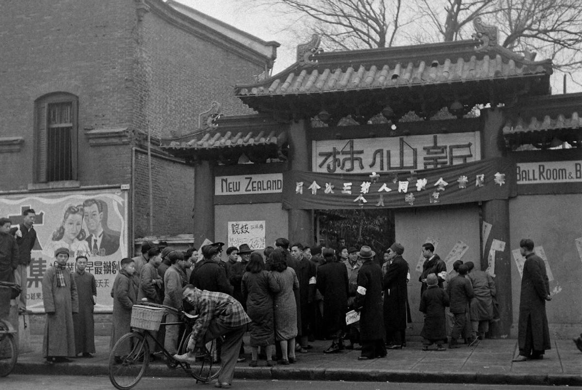 (17)1948年,上海禁舞影响舞女生计。上海舞女工会组织旗下各支部上街抗议游行。在新仙林舞厅门口也有警察和便衣管控秩序。