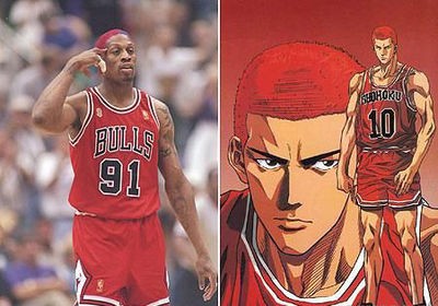 一样的问题人物,一样是花花绿绿的头发,一样有张扬的个性,同样是打架高手,同样是篮板球行家,也同样拥有超人的身体素质。两人同样是通过自身的努力而获得队友的认可。最后要说樱木和罗德曼有一点最大的不同,就是樱木是故事的主角而罗德曼却不被NBA主流所接纳。