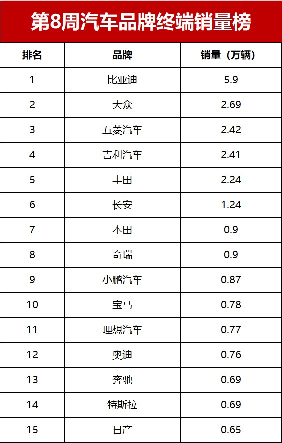 各位车友和关注汽车行业的朋友们,又到了一周汽车销量榜单解读时刻。2025年2月17日至2月23日的汽车品牌终端销量排行榜已经出炉,让我们一起来深入剖析2月第四周(2025年第8周)汽车市场的亮点与趋势。