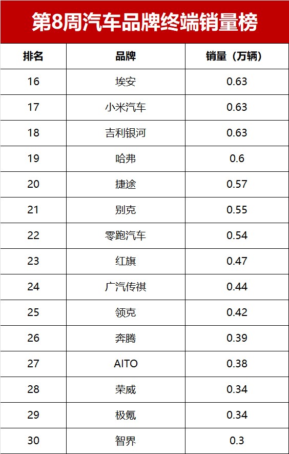 2月第四周汽车品牌销量榜!大众位列第二,小鹏第九名