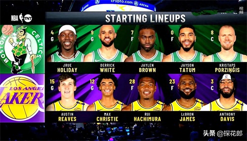 湖人现在的排名西部第5位,上一场战胜弱旅奇才。这场比赛湖人迎来了一场硬仗对阵卫冕冠军东部第二的凯尔特人。湖人的首发阵容是詹姆斯,浓眉哥,八村塁,里夫斯和克里斯蒂。凯尔特人首发阵容是塔图姆,布朗,波尔津吉斯,怀特和霍勒迪。