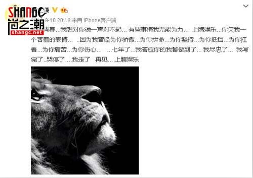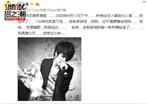 “那天我记得很清楚。。。2005年9月11日下午。。。所有经纪人都在办公室。。。我进来了。。。1分钟内我落下笔。。。老板很惊讶。。。问我。。。你不需要看合同吗。。。我说。。。我想唱歌。。。我信任你。。。后来。。。老板做完我第一张专辑后走了。。。我再撑七天。。。结束这七年。。。”
