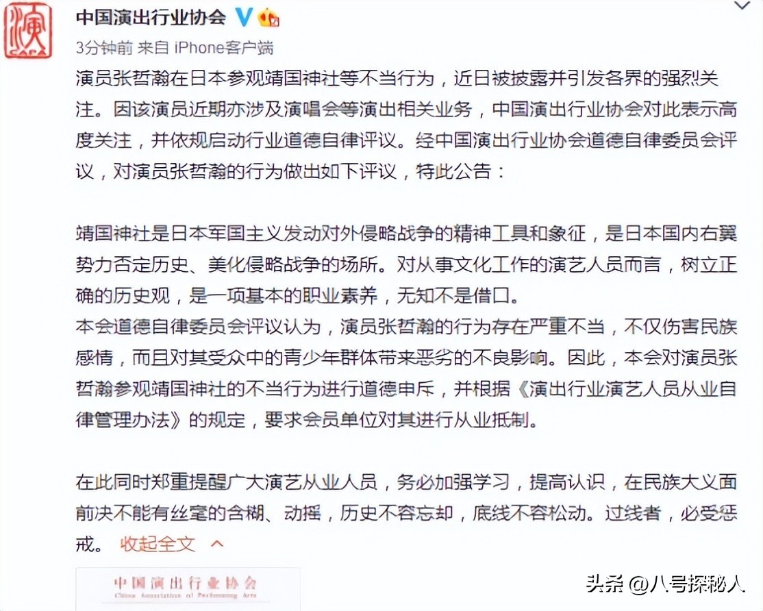 最后由演出行业协会正式对张哲瀚进行了“封杀”。