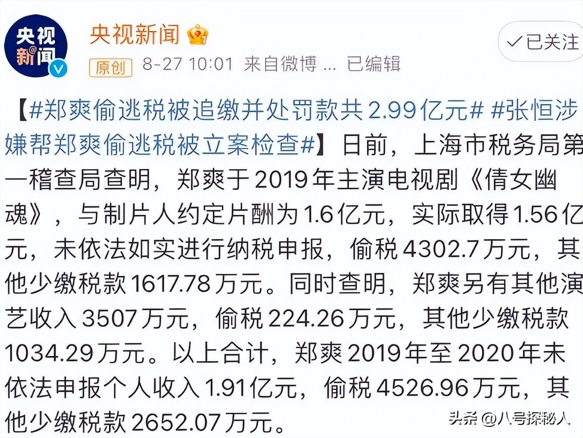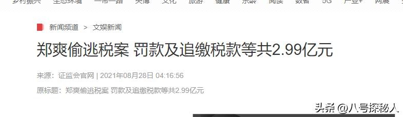 央视网——郑爽偷逃税案 罚款及追缴税款等共2.99亿元